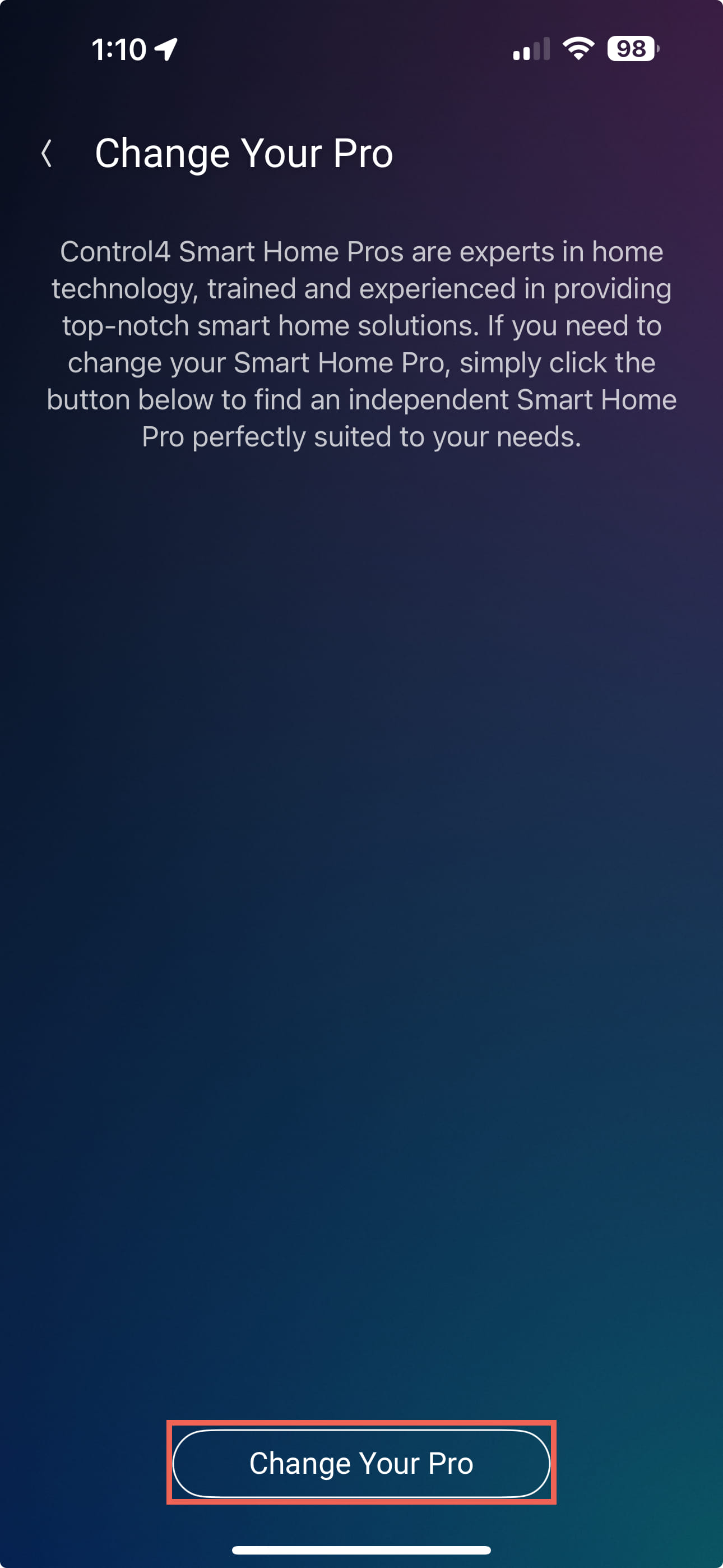 Otevřete mobilní aplikaci Control4, přejděte do Nastavení > Podpora > klepněte na Váš Control4 Pro, klepněte na ikonu osoby v pravém horním rohu a poté klepněte na Změnit svého profesionála.