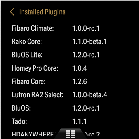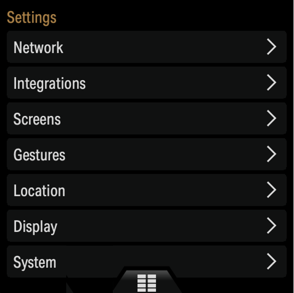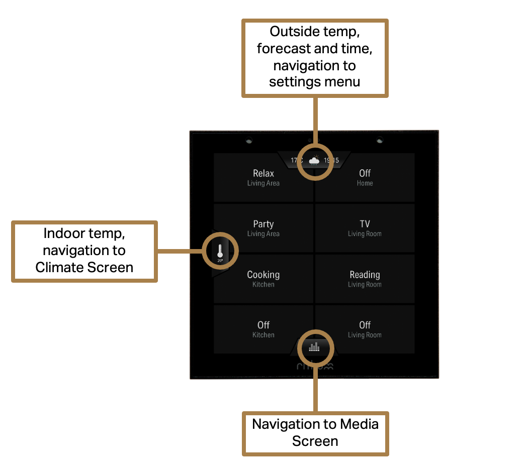 Obrazovka 'Scenes' bude přítomna vždy, zatímco obrazovky 'Audio' a 'Climate' vyžadují nejprve konfiguraci a/nebo kompatibilní plugin.