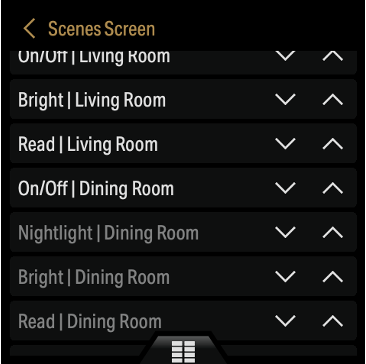Všimněte si, že obrazovka 'Scenes' podporuje až 8 scénových tlačítek. Jakákoli další budou v menu nastavení zašedlá, ale lze je posunout výše, aby měla prioritu.