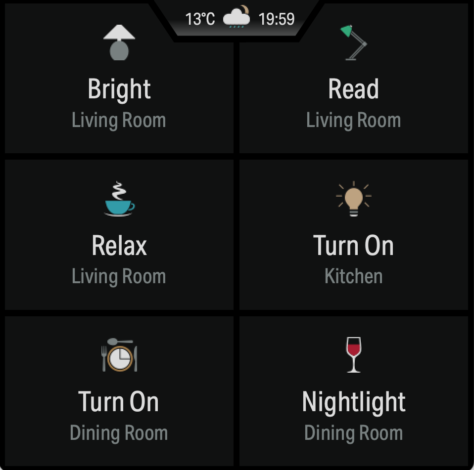 Obrazovka 'Scenes' zobrazuje scény, které jste vybrali v menu 'Screens' > 'Scenes Screen'. Stačí klepnout na scénu a aktivovat ji.