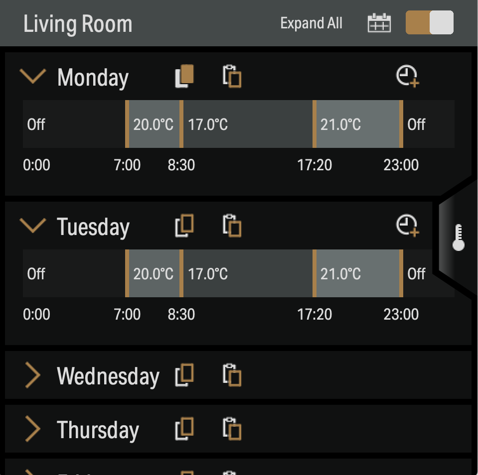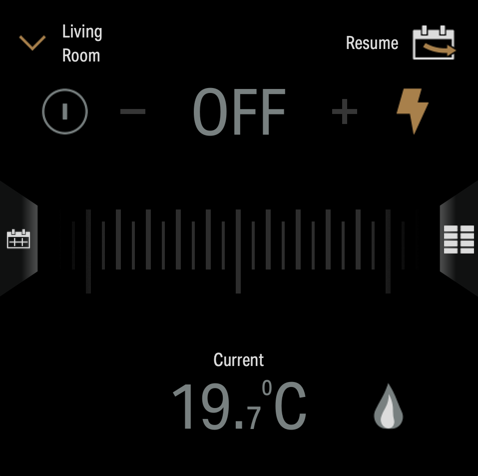Všimněte si, že jakákoli ruční úprava stavu zapnutí/vypnutí zóny nebo požadované teploty přepíše jakýkoli plán (schedule). V případě 'Rithum Stat' se to resetuje při další naplánované události nebo tlačítko 'Resume' (Pokračovat) okamžitě obnoví plán. U ostatních integrací je přepsání definováno samotnou integrací.