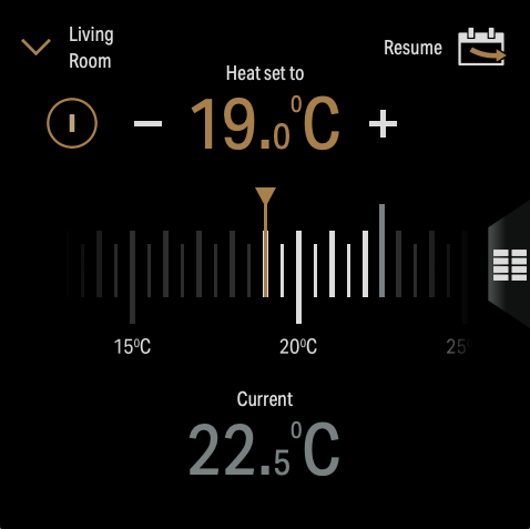 - Všechny změny provedené na obrazovce 'Climate' přepíší aktuální teplotu podle plánu (schedule). Budou automaticky odstraněny v době příští naplánované změny. Pro manuální návrat k aktuálnímu stavu plánu stiskněte tlačítko 'Resume' (Obnovit) v pravém horním rohu obrazovky.