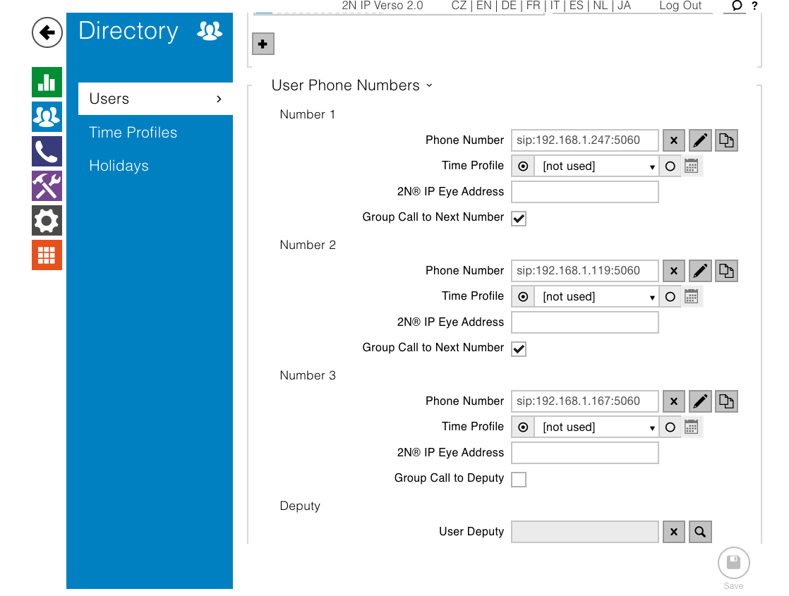 - Pokud tohoto uživatele nastavujete pro více přepínačů, můžete přidat další adresy do polí 'Phone Number' pro číslo 2 a/nebo číslo 3. S největší pravděpodobností budete chtít povolit 'Group Call to Next Number' (Skupinové volání na další číslo), aby se na přepínače volalo současně.