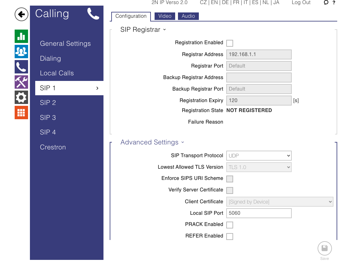 - Ponechte registraci 'SIP Registrar Registration' zakázanou, protože budeme používat P2P SIP hovor, a ne se registrovat k SIP serveru. Nastavte 'SIP Transport Protocol' na UDPneboTCP(TLS není podporováno) a 'Local SIP Port' (Místní SIP port) na 5060.