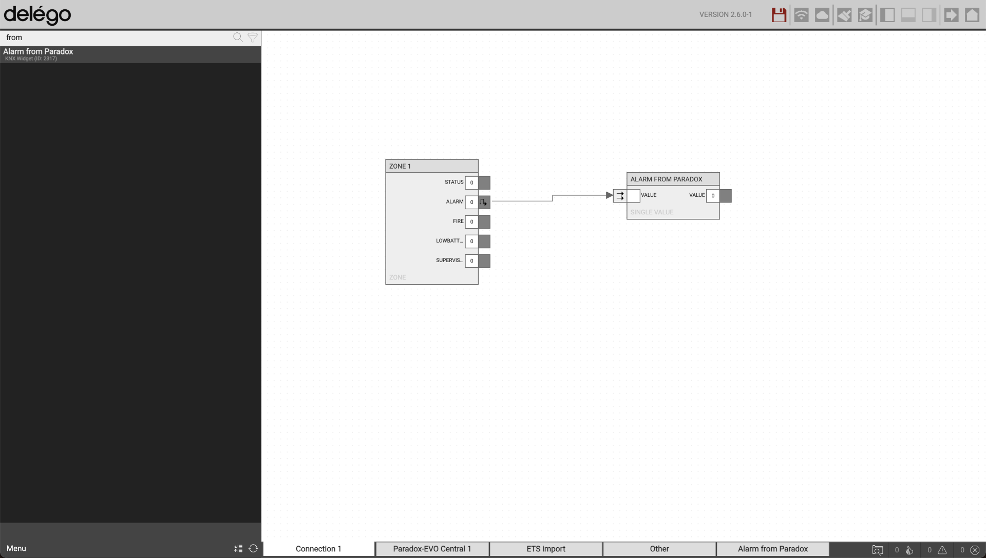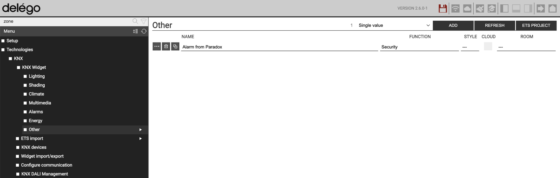 • Přetáhněte (Drag&Drop) widget zóny Paradox a nově vytvořený KNX objekt na plochu.