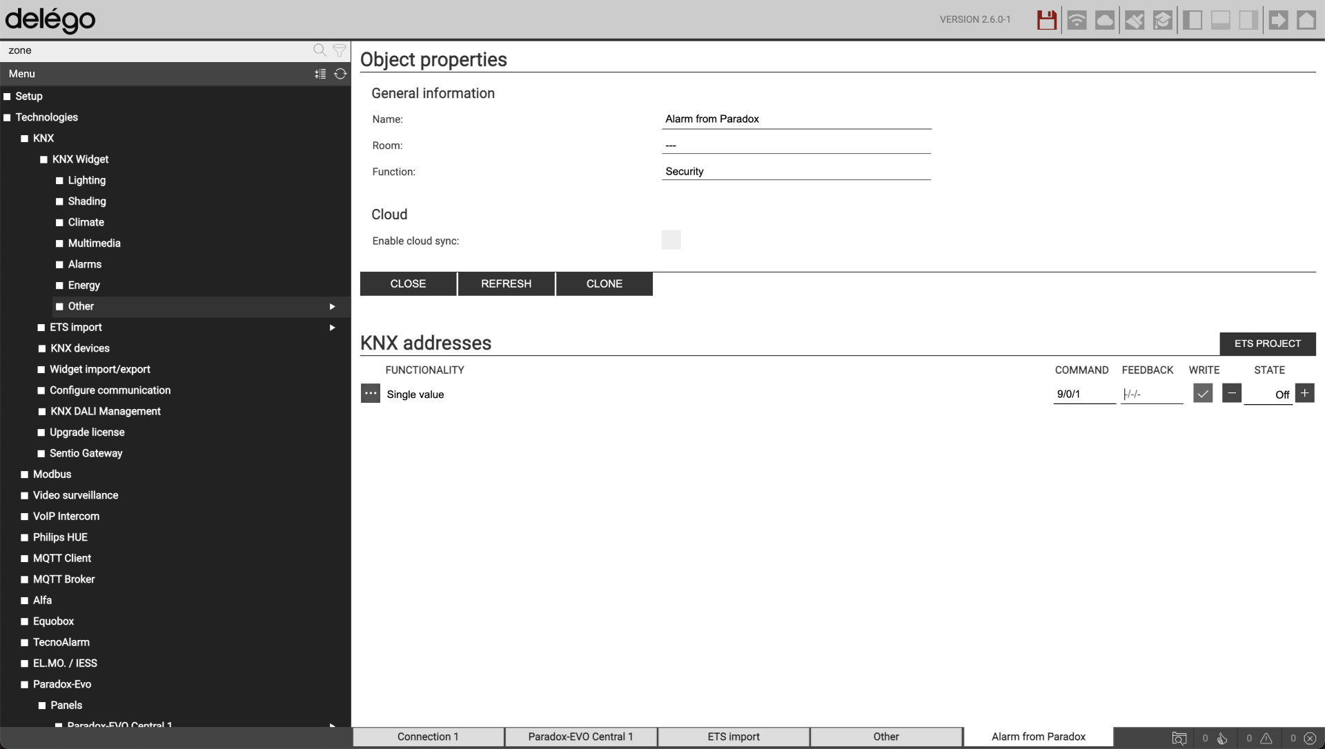 2. Metoda "Connection": Přenos stavů z Paradoxu na KNX sběrnici