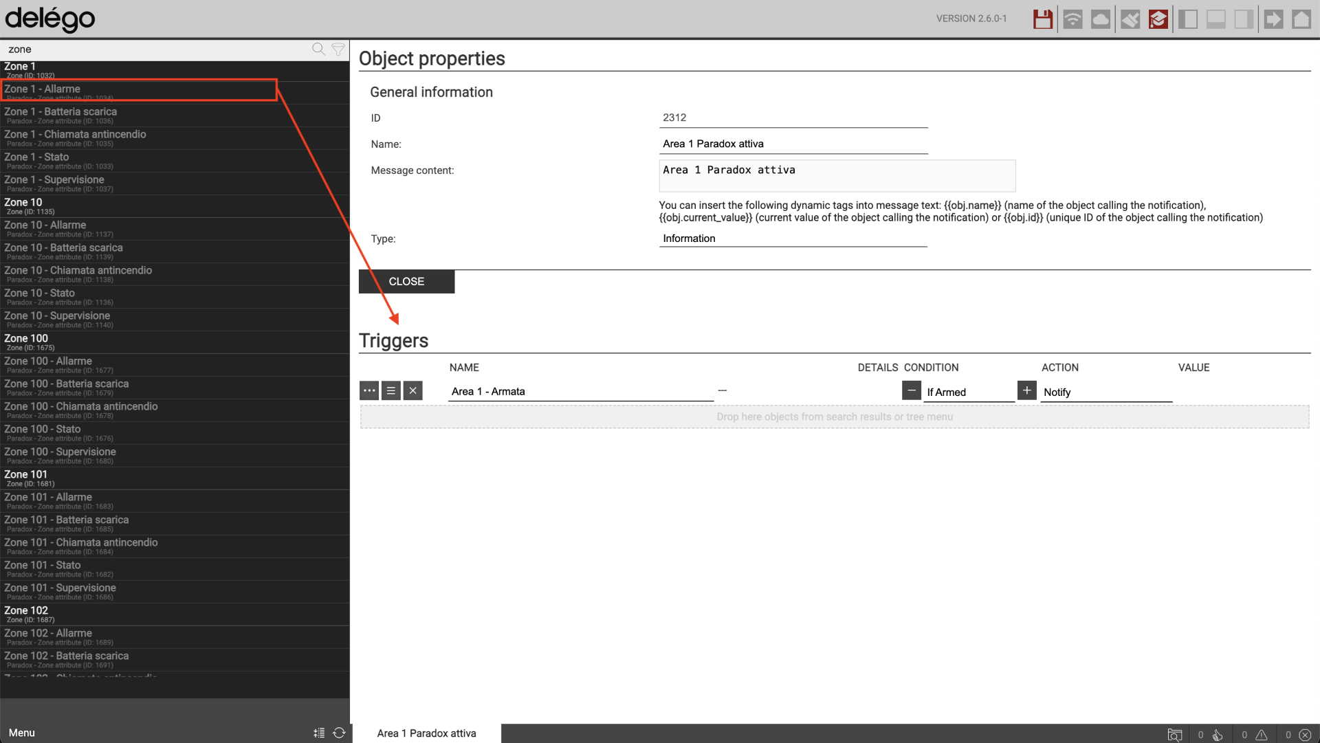 4. Identifikujte konkrétní podobjekt (např. Zone 100 - Allarme).