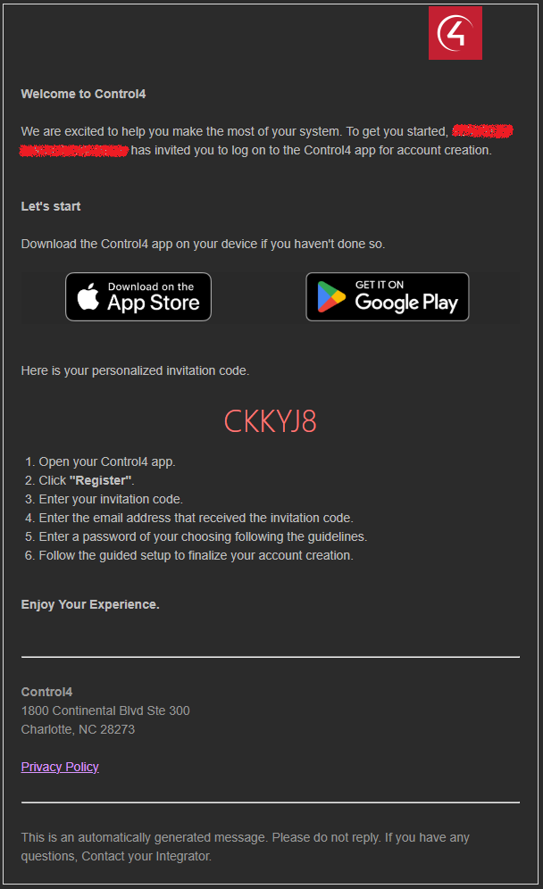 Na vaši e-mailovou adresu přijde zpráva od společnosti Control4 s pozvánkou k vytvoření účtu.