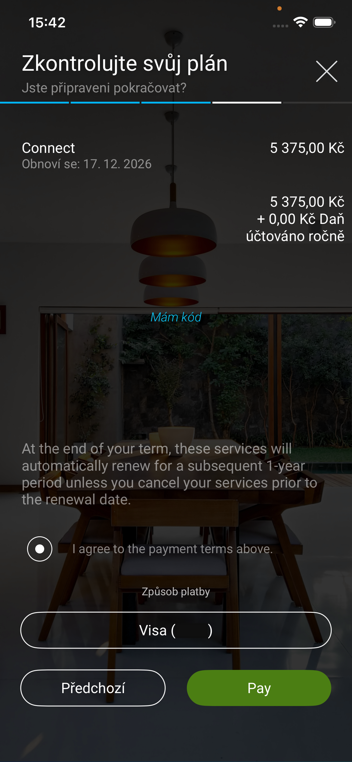 Pokud si zvolíte službu Connect, budete požádáni o zadání platební karty.