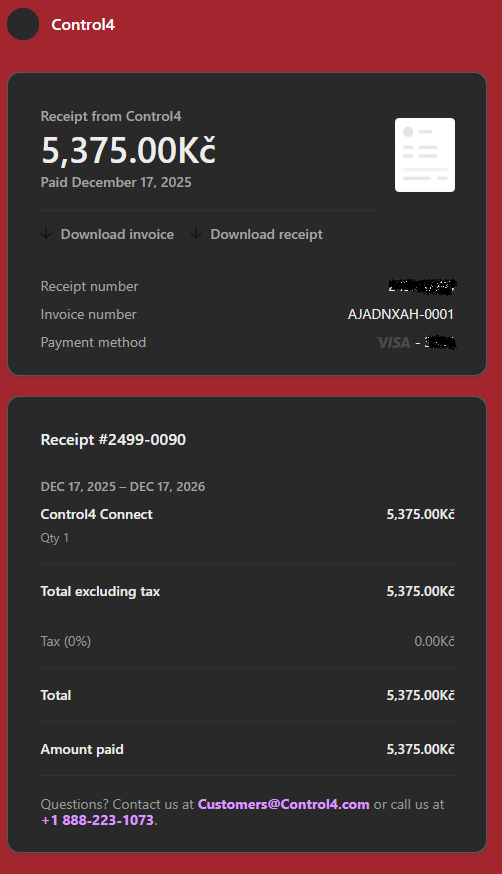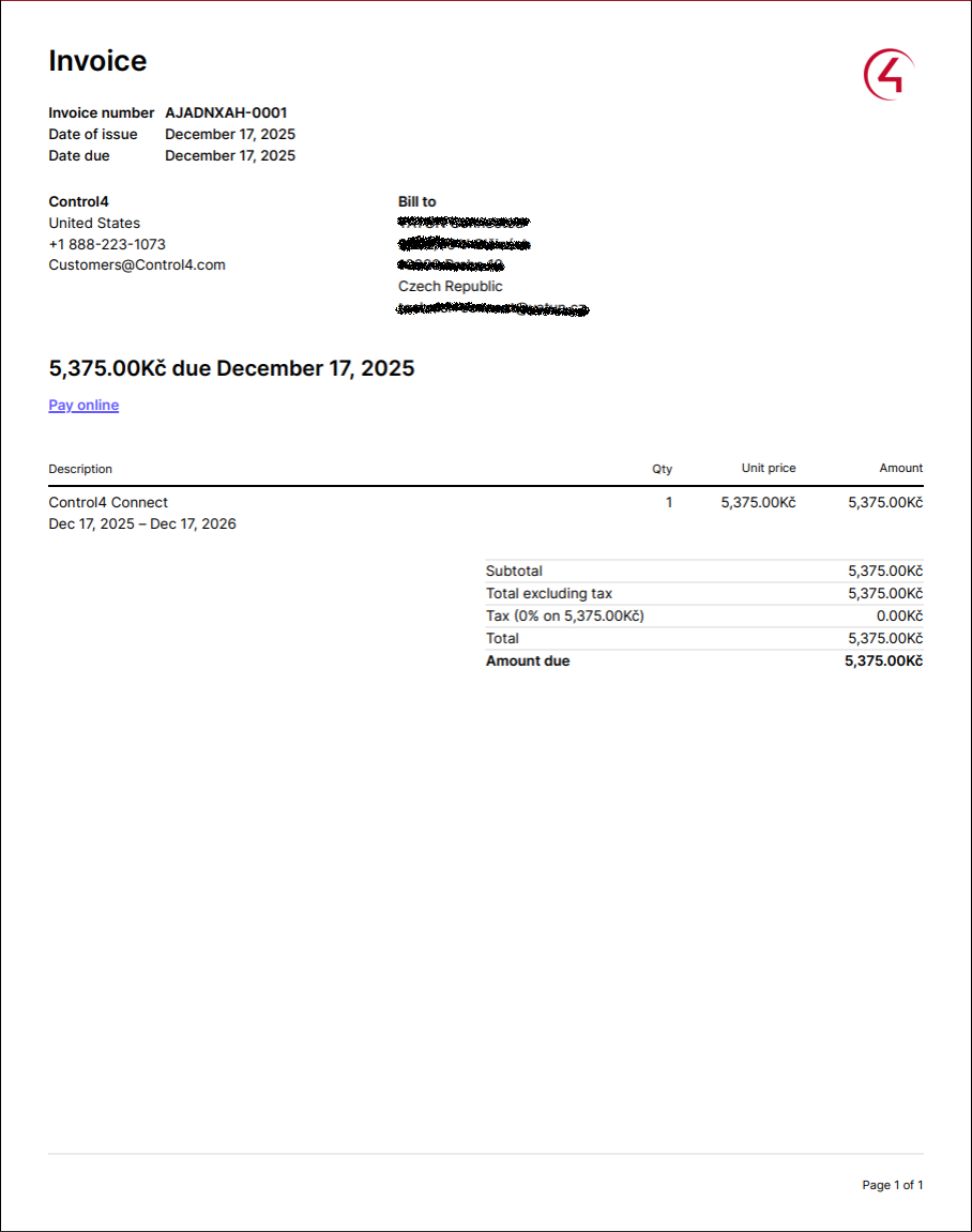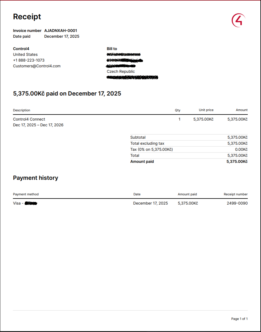Po úspěšné registraci a zaplacením Control4 Connect, pokud jste nezvolili v bodě 6 druhou možnost, vám přijde faktura a Účet. Ta bude mít následující podobu.