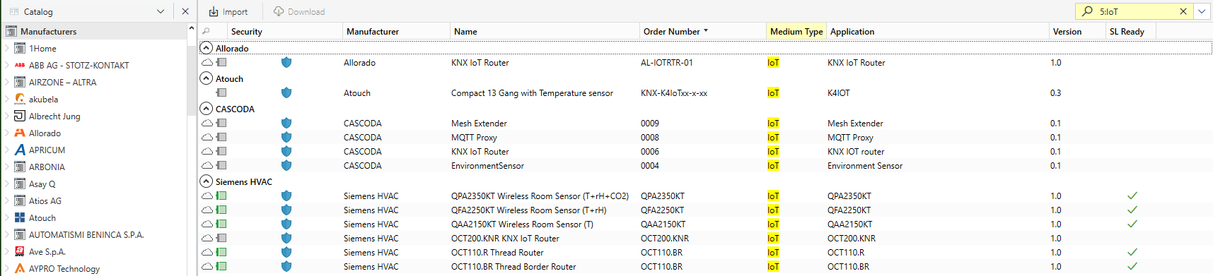 - medium:IoT sl:x pro vyhledání, která komunikují protokolem KNX IoT a zároveň podporují funkci Smart Linking Ready.